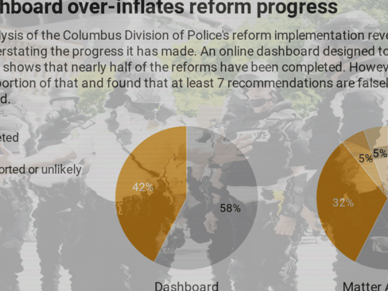 A Matter analysis of a dashboard meant to show the public the Columbus Division of Police's reform progress revealed that some reforms were falsely reported as complete, raising questions on accuracy.