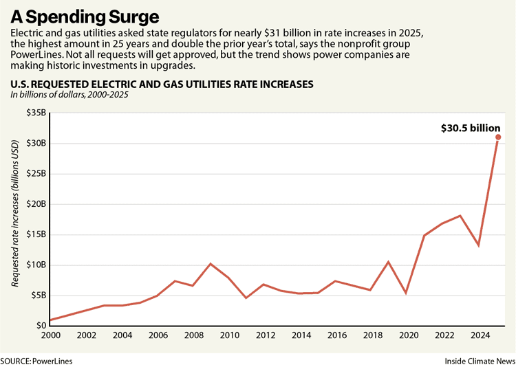 For these state public utility commissioners, tasked under federal law with ensuring that electricity rates are “just and reasonable,” 2025 was a year like no other. Electric and gas utilities requested nearly $31 billion in rate increases, more than double the $15 billion they requested in 2024, according to research by PowerLines. S&P Global’s Regulatory Research Associates said it was the highest level of utility rate requests since the early 1980s.