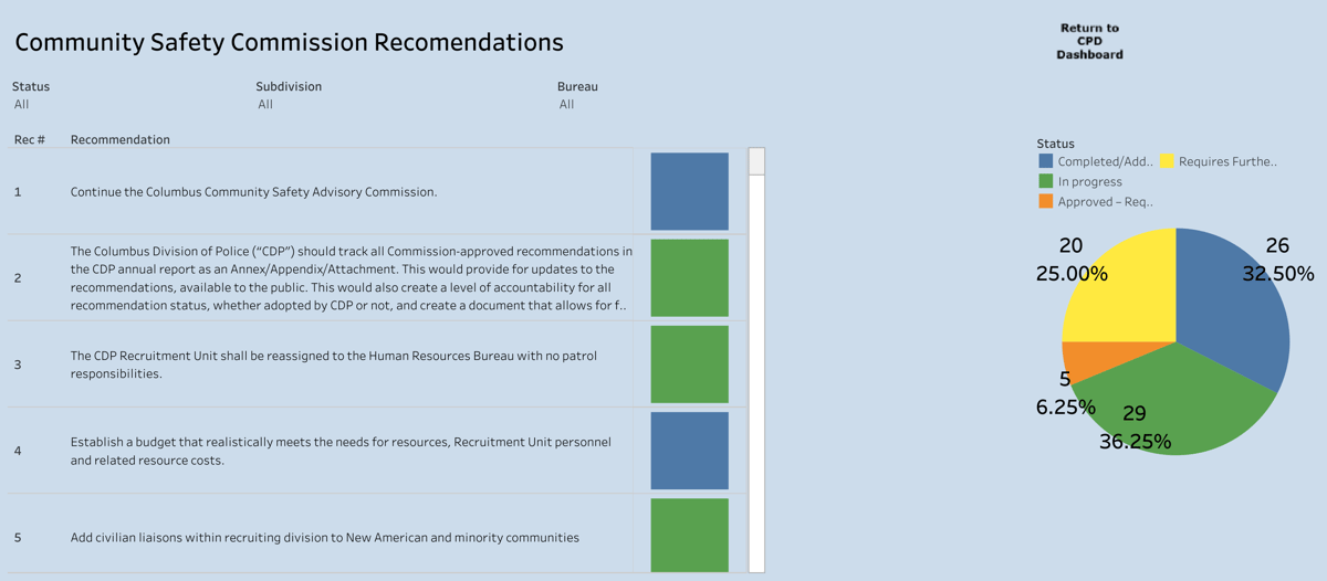 The Columbus Division of Police launched a new dashboard website, on October 1, 2020, designed to provide accountability and transparency on the progress the former police chief, who was hired for this task, has made toward implementing citizen-led reform.