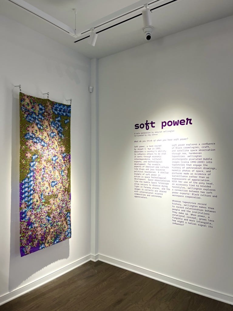 Over the last year, however, Wellington has begun to adopt a different view of the pony beads, coming to see them more as individual pixels, and pixels that can nod to history. This evolution bleeds into the work on display in “soft power,” which eschews words in favor of more colorfully amorphous, galactically inspired images rooted in the earliest photographs returned to Earth by the Hubble Space Telescope, launched in April 1990.