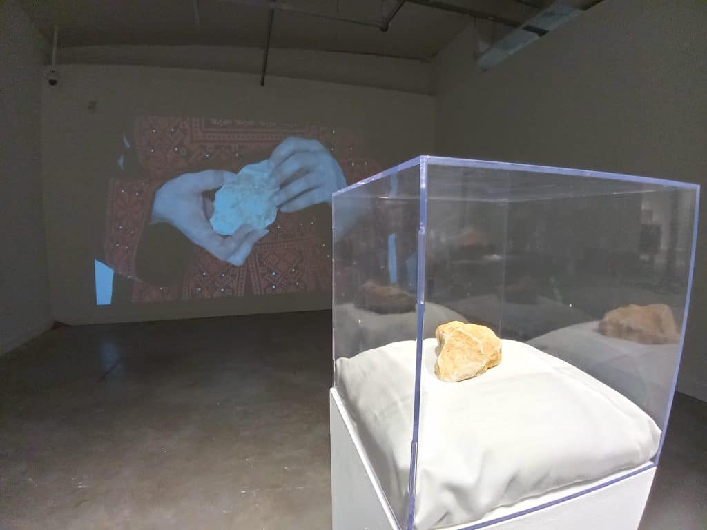 Similar wounds exist within “Cartography,” curated by Mona Gazala and existing just a few steps away. This is particularly true of Gazala’s “Disarticulated,” which includes a short film showing the aftermath of the Israeli destruction of a Palestinian home and stands as a metaphor for the purposeful disassembling of the Palestinian people. The film is accompanied by a stone rescued from the site in 2018 and transported to Gazala via a series of handoffs, beginning with Palestinian artist and filmmaker Emily Jacir and ending in Chicago, where Gazala traveled to receive the artifact from Iraqi American artist Michael Rakowitz. Even now, Gazala has difficulty discussing the impact of the exchange, recalling how the emotional trauma embedded within the object left her briefly confined to her bed.