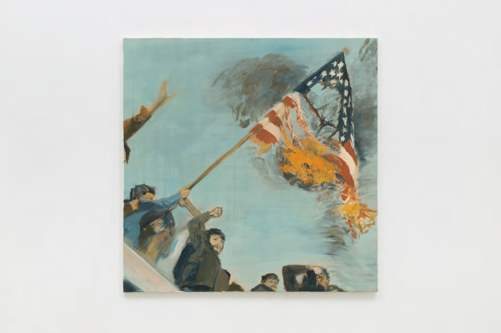 Other images on display within “American Inquisition” have been given unintended new resonance in light of current events, and in particular Addanki’s “The Great Satan,” which the artist based on a famed Getty photograph that shows Iranian demonstrators burning the US flag atop of the embassy in 1979. Addanki said the idea for the work arose from the 12-Day War of June 2025, adding, “I certainly never hoped we’d be landing in Columbus in the midst of an expanded version of that.”